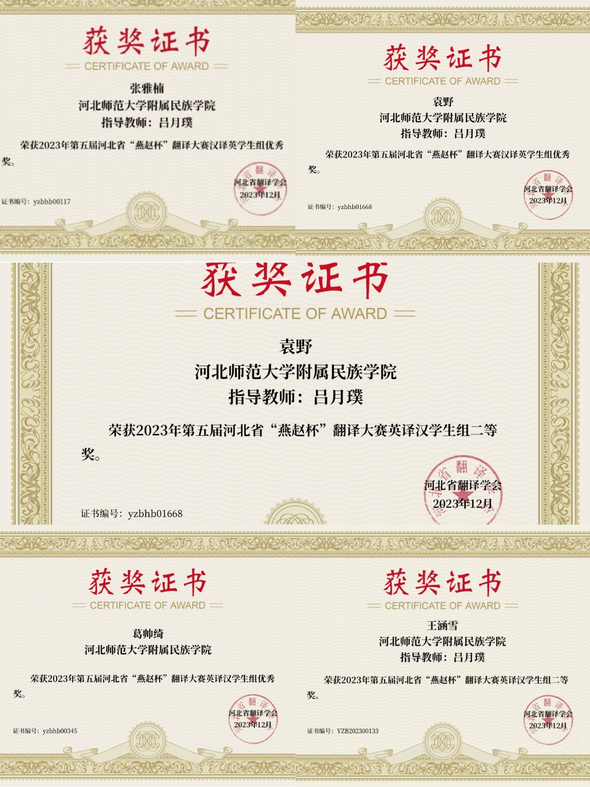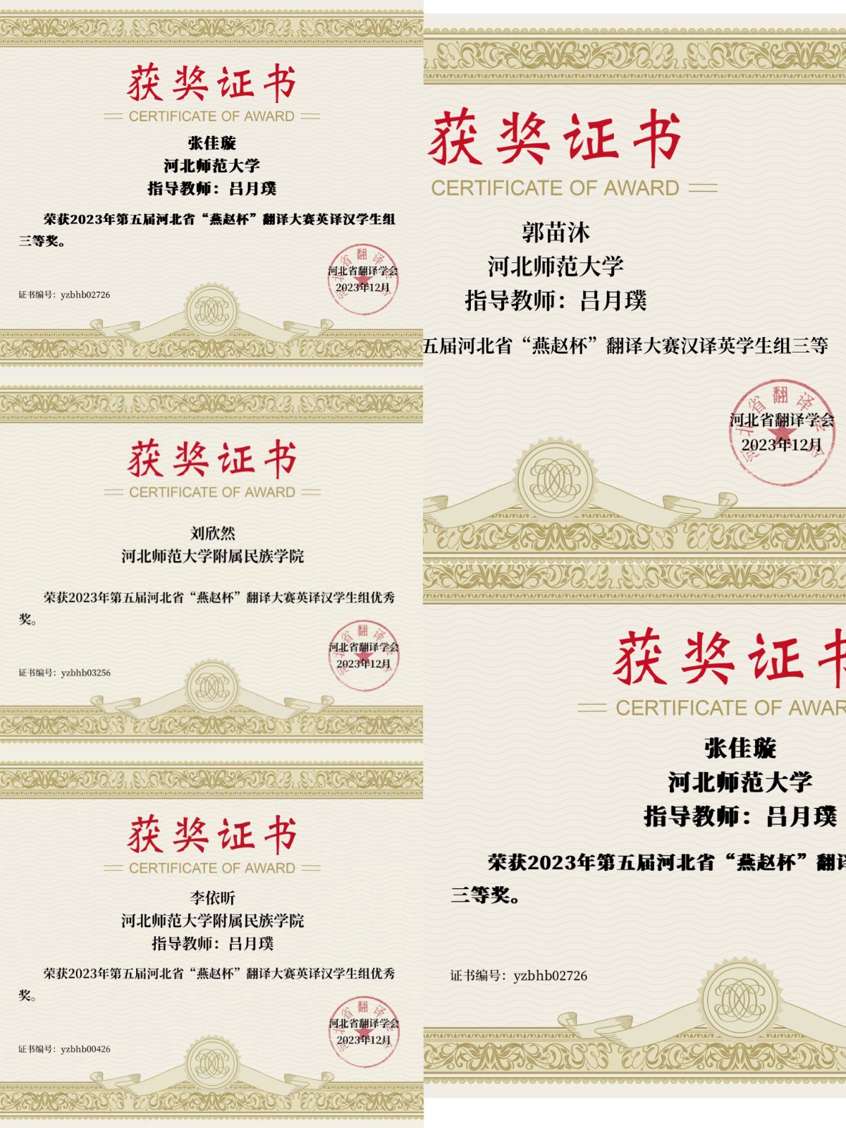近日,第五届河北省“燕赵杯”翻译大赛圆满闭幕。比赛由河北省翻译学会主办,设有英译汉、汉译英,日译汉、汉译日,俄译汉、汉译俄,法译汉、汉译法,韩译汉、汉译韩组别比赛。经过激烈角逐,jdb电子英语系学生最终斩获15个奖项,其中二等奖三名,三等奖四名,优秀奖六名,实现历史性突破。