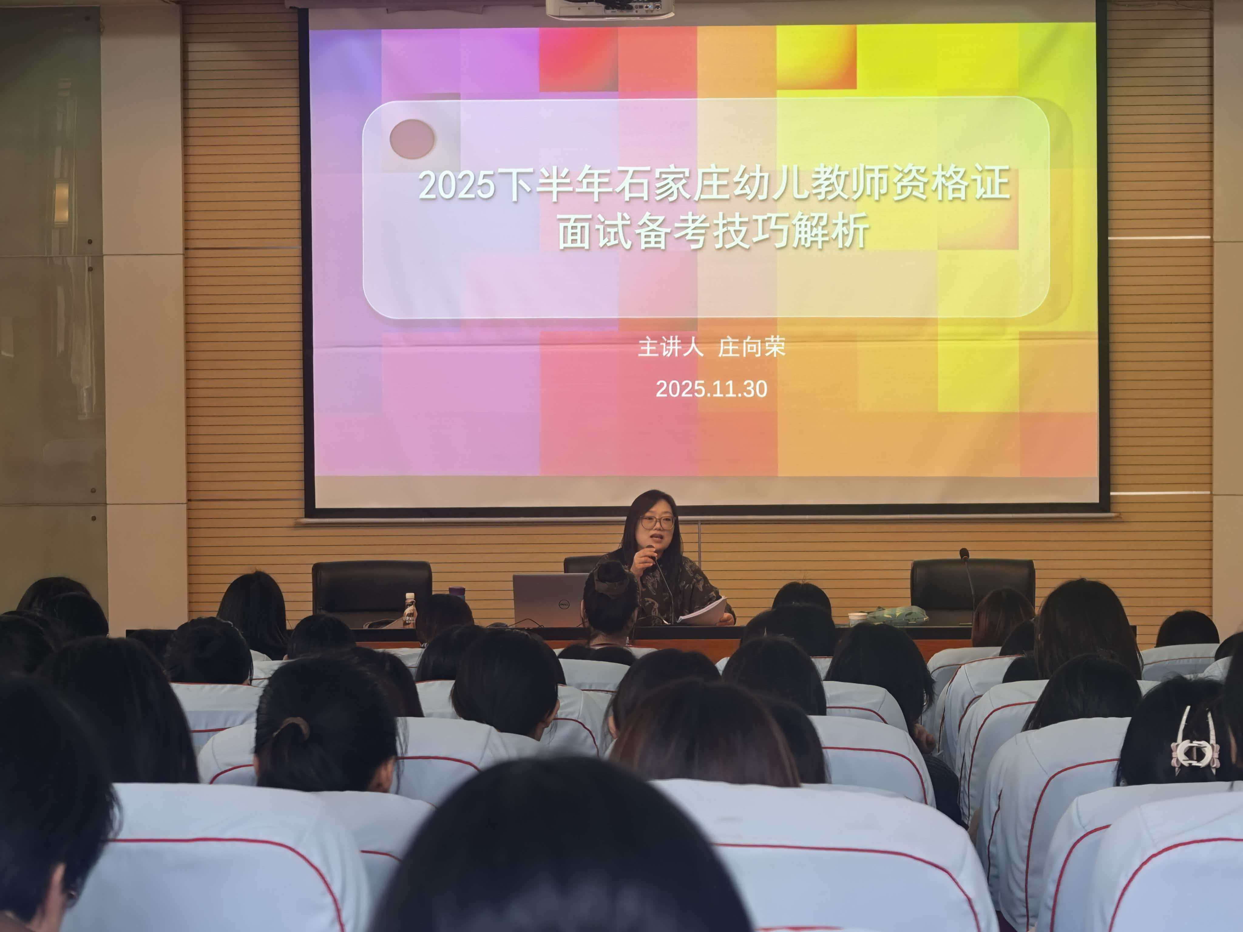 ‌为有效提升学生参加教师资格证国考面试的能力,助力2021级学前教育专业学生顺利迈入幼教岗位,基础教育系于11月30日举办幼儿园教师面试专项培训活动。本次活动特邀石家庄市桥西区第三幼儿园书记、园长、高级教师庄向荣担任主讲,为该专业全体学生提供专业面试指导,切实筑牢面试备考基础。